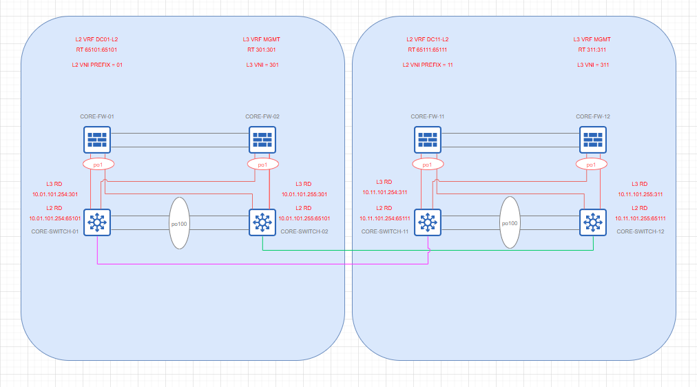 From the Data link layer perspective, we are using the same RT allowing for L2 connectivity within the Datacenter, yet from the Network layer view, we are standing up a separate IP VRF allowing for L3 connectivity to and from the switches.