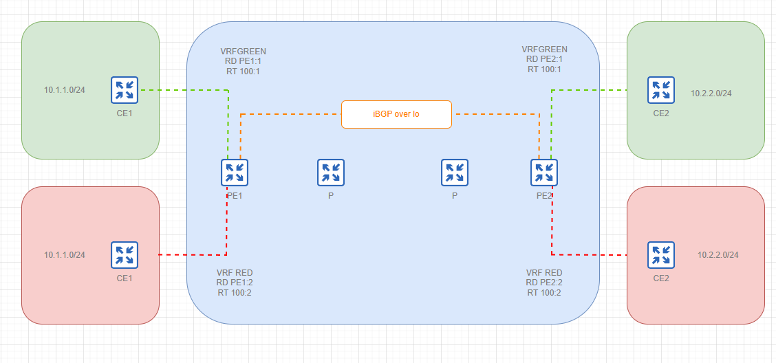 First of all the IP VRF needs to be defined with a clear route distinguisher unique to each VRF. In our case we are going to create two - one for Client A (VRF GREEN RD RouterID:1) and for Client B (VRF RED RD RouterID:2). Here RouterID is unique to each PE and 1/2 are the VRF numbers.