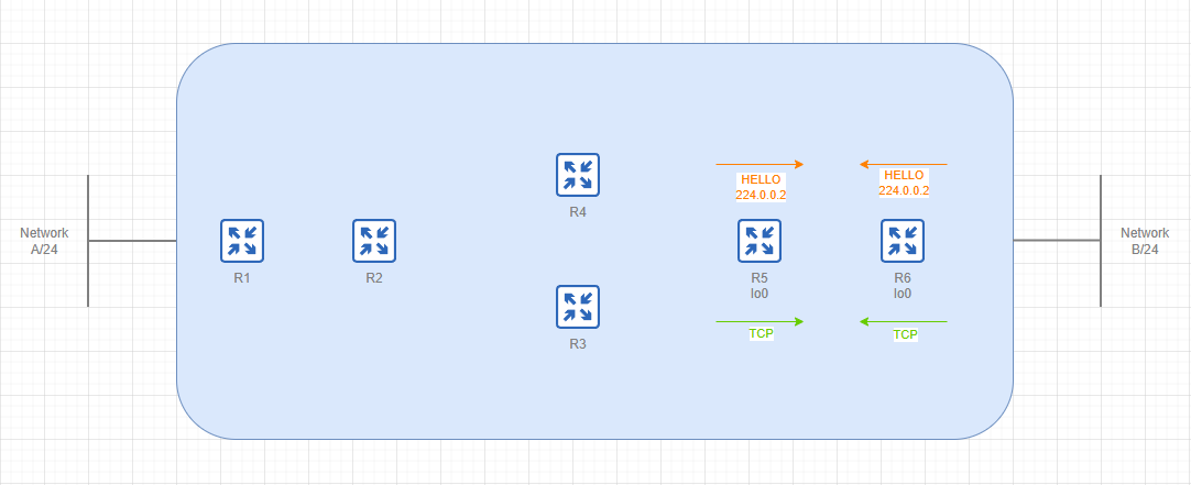 On this diagram we can see six MPLS enabled routers with two /24 networks at the edge. Router 5 and Router 6 (so as the others) start exchanging Multicast UDP Hello messages looking to establish a TCP LDP session with neighbors.