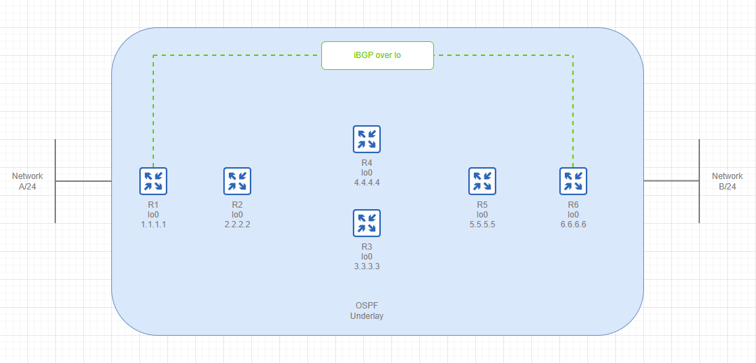 The next step here is to bring up an iBGP (technically can be an eBGP) session between our edge routers R1 and R6 and start exchanging the routing information about prefixes A/24 and B/24 thus making our transit network absolutely unaware of those prefixes.