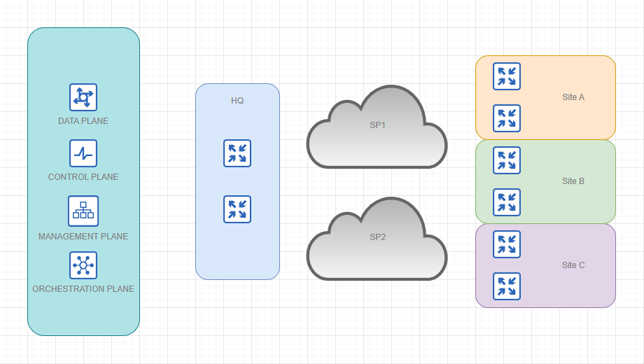 - Data plane controller - is basically responsible for the encrypted data transit in our network. It's looking after the traffic paths (routing protocols) running through the IPsec tunnels between the endpoints.